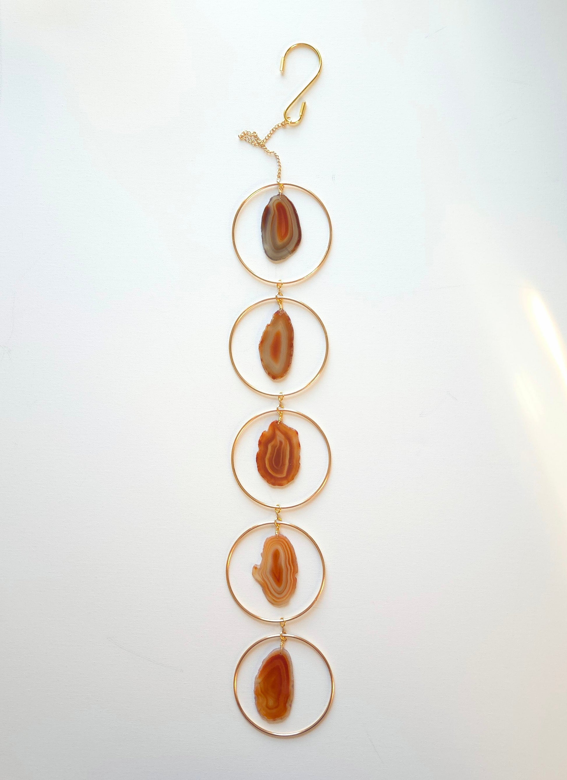 A collection of coordinating sliced agates encircled in decorative brass hoops. Please place in a South or West facing window for best results. Please keep out of the elements to prevent tarnish of metals.
