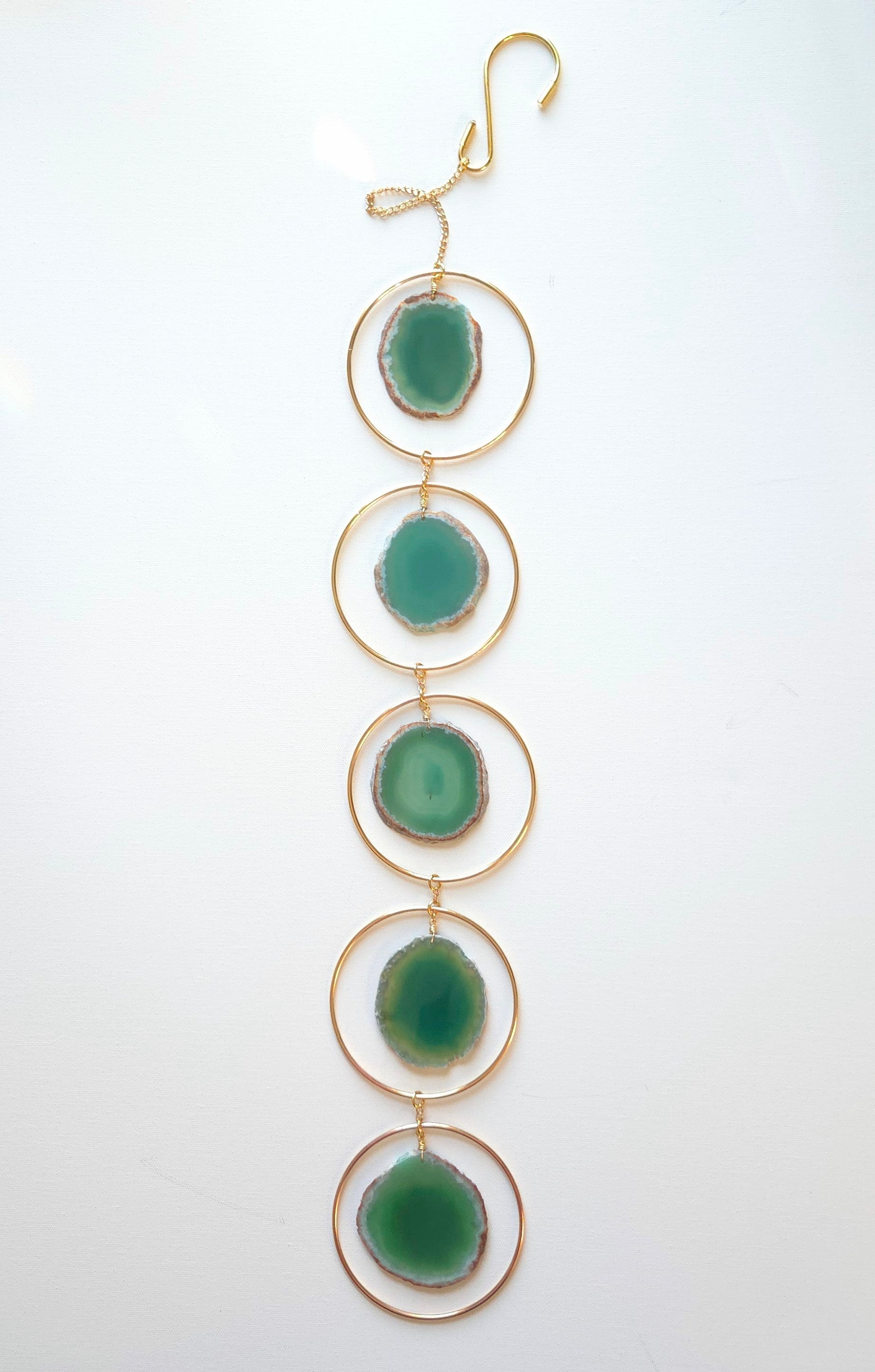 A collection of coordinating sliced agates encircled in decorative brass hoops. Please place in a South or West facing window for best results. Please keep out of the elements to prevent tarnish of metals.